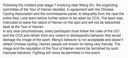 De aanrijdingquote:De organisatie van de Tour of Hainan heeft de Chinese renner Wang Xin (Keyi LOOK) gediskwalificeerd na een bizar incident. Nadat Wang Xin tijdens de zevende etappe ten val was gekomen na een aanrijding met de ploegwagen van de Zwitserse nationale ploeg, ging hij helemaal door het lint. Aan de finish mepte hij erop los en ging zelfs een pomp halen uit zijn volgwagen om mee uit te halen...