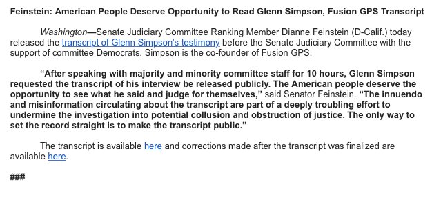 twitter:kylegriffin1 twitterde op dinsdag 09-01-2018 om 19:15:50This is big. Dianne Feinstein has released the transcript of Fusion GPS co-founder Glenn Simpson's testimony to the Senate Judiciary Committee http://bit.ly/2CWRtdE