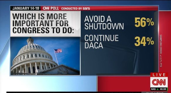 Waarom zouden de Republikeinen daarvoor iets in ruil moeten krijgen? Ze zijn er toch voor dat de Dreamers moeten kunnen blijven? Dat beweren ze tenminste de hele tijd.quote:Op zaterdag 20 januari 2018 00:03 schreef Nintex het volgende: