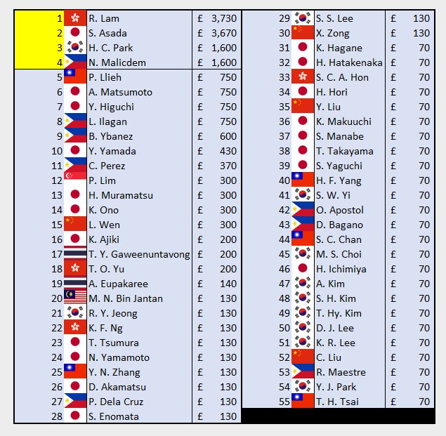 Zoekt uw favorieten: Asada, Gaweenuntawong, Ilagan, Royden Lam, Kai Fan Leung, Harith en Paul Lim, Muramatsu, Ono, Christian Perez.