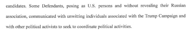 twitter:kylegriffin1 twitterde op vrijdag 16-02-2018 om 22:31:01I keep reading this over and over: “Some Defendants, posing as U.S. persons and without revealing their Russian association, communicated with unwitting individuals associated with the Trump Campaign and with other political activists to seek to coordinate political activities.” https://t.co/mMFtxS7PUW reageer retweet