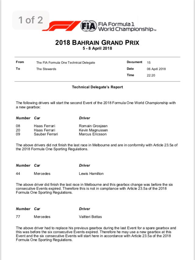 twitter:adamcooperF1 twitterde op vrijdag 06-04-2018 om 21:53:50Just after the FIA confirmed that @lewishamilton will get a gearbox penalty it started to rain in the Bahrain paddock. All kicking off here! reageer retweet