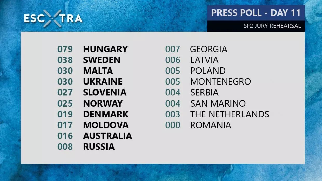 Wat de perspoll betreft, da's altijd een beetje dubbel ja. Enerzijds weten zij wel wat het goed doet op het Songfestival, maar vorig jaar plaatsten zij Finland ook helemaal bovenaan, terwijl het niet doorging. Het is gespecialiseerde pers, en die hebben de nummers allemaal ook al honderd keer gehoord, dus een frisse blik hebben ze daar niet meer.