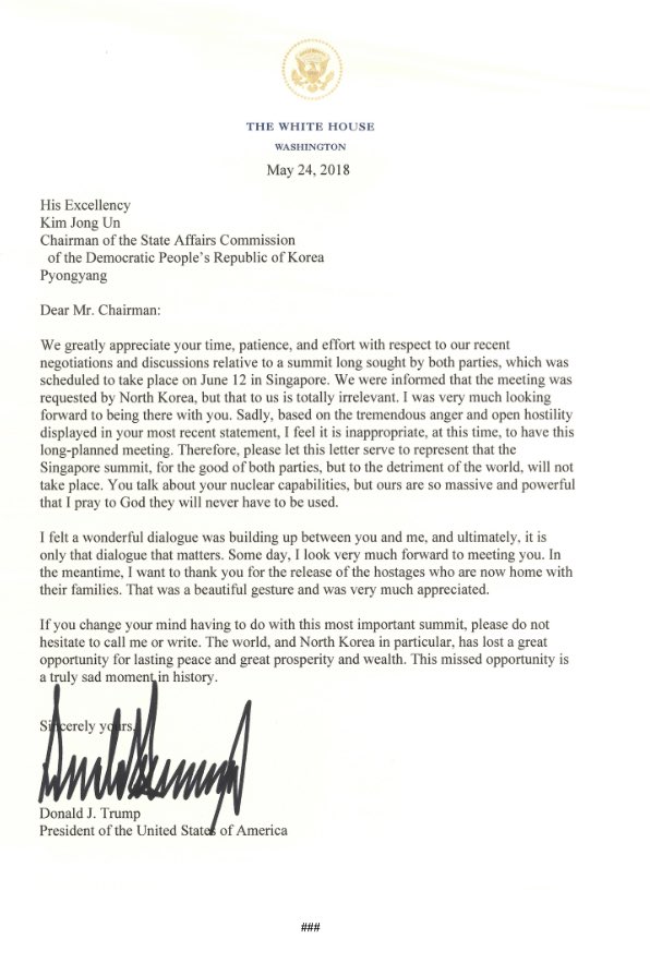 Het is even wachten op de zwakke spin die het Witte Huis hieraan gaat geven. Dat wordt dan voor de nacht valt het narratiefje, en dat komt hij en anderen hier vervolgens heus wel papegaaien hoor. Geef ze wat tijd.quote:Op donderdag 24 mei 2018 16:10 schreef Ulx het volgende: