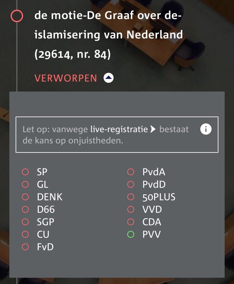 Ik ben benieuwd naar de verklaring van met name CDA en CU voor het instemmen met dat moskeeën en gebedshuizen bij Nederland horen. Ik vraag mij ook af waarom FvD de PVV niet heeft gesteund in haar motie om te de-islamiseren.