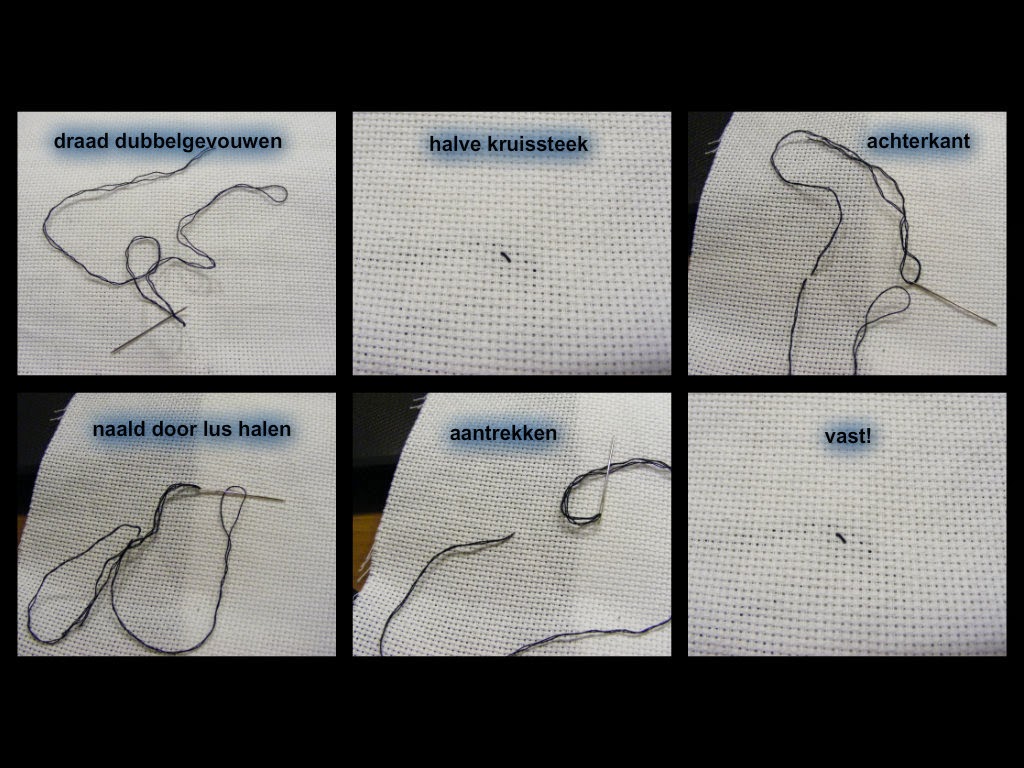 Ik trek eerst een streep met de naald, hoek van 45 graden of zo. Dan worden de grotere gaten net wat duidelijker zichtbaar. Zelfs met twee brillen heb ik dit nodig. | |