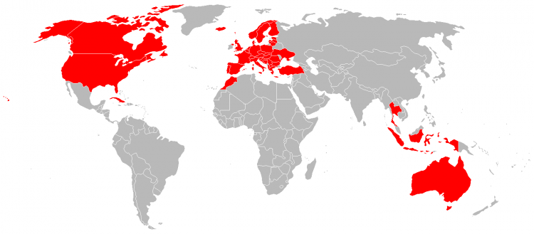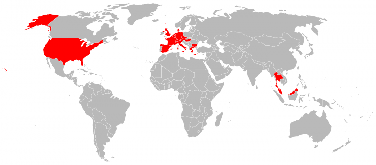 | Duitsland Frankrijk Spanje (zeer lang geleden) Portugal (idem) Italië Tsjechië Bosnië Kroatië Thailand Cambodja Filipijnen Vietnam | ||