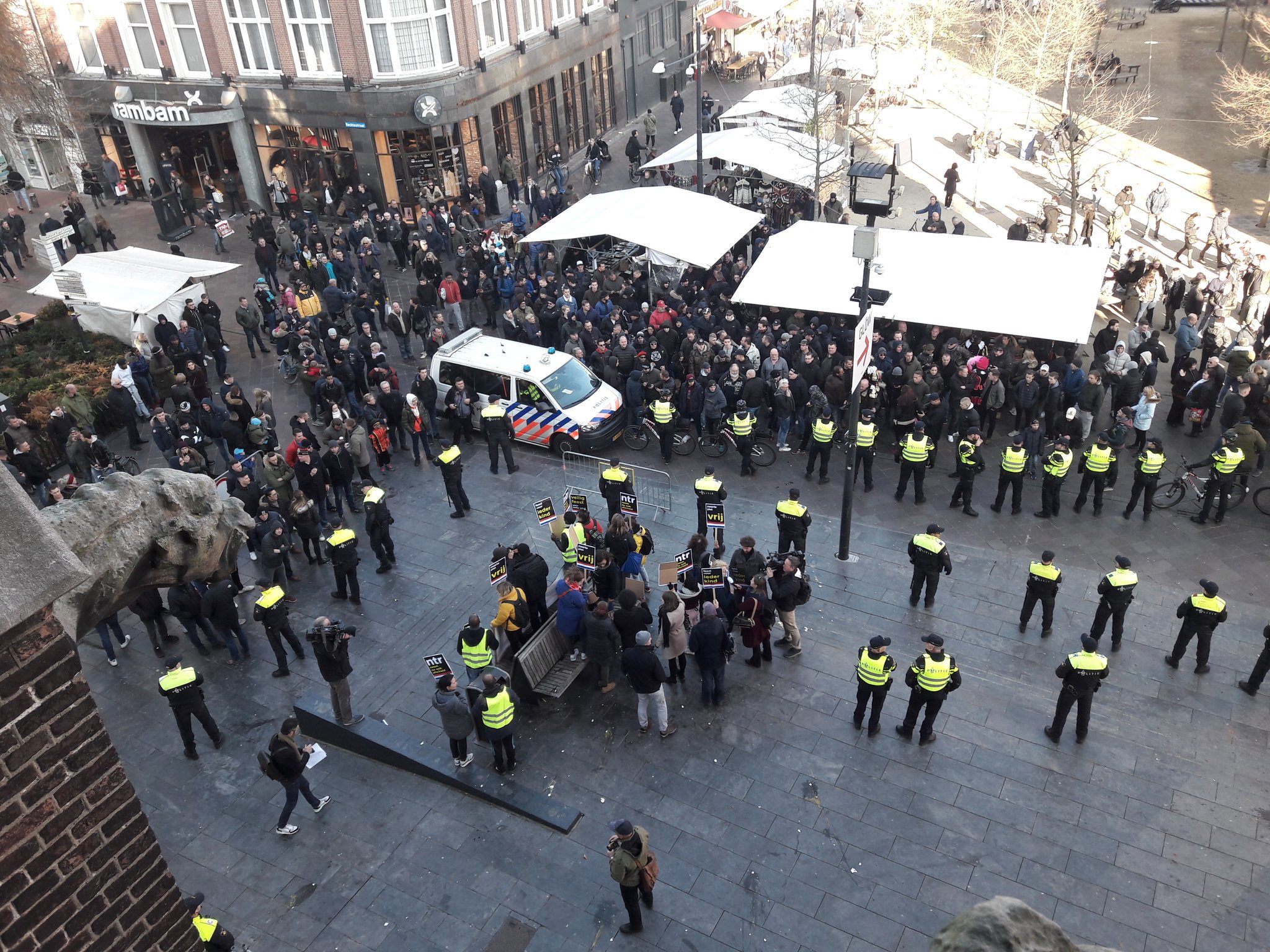 De sfeer werd al eerder wat grimmiger rond de Catharinakerk. Maar toen de stoet van Sinterklaas net gepasseerd was, ging het even los. Er werd met eieren en blikjes gegooid en de politie greep snel in. De politie was al met extra mensen aanwezig, in verband met de aangekondigde demonstratie van Kick Out Zwarte Piet (KOZP).