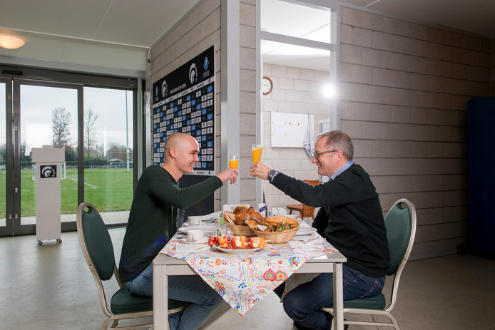 Dochter Alies van Hanegem heeft beelden op internet gezet van vader Willem van Hanegem die een oliebol in een schaal kopt.