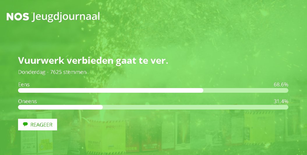 Maar dat is nog altijd met een kanon op een mug schieten vind ik. Natuurlijk is handhaven makkelijker met een algemeen verbod, maar het zou al schelen als vuurwerk slechts op de dag zelf verkocht mag worden, de straffen heel fors verhogen en dat ook echt handhaven. | |