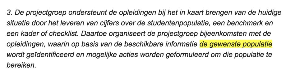 De zaken die de Telegraaf benoemd worden in het plan in de bijlage genoemd als zaken die tijdens gesprekken met studenten vooraf benoemd zijn, niet dat dit concrete plannen zijn of dat ze überhaupt voornemens zijn om er iets mee te doen. Verder is de opdracht in het projectplan om te onderzoeken in hoeverre opleidingen bepaalde groepen uit onze samenleving (culturele groepen, mannen/vrouwen, sociaal-maatschappelijk achtergestelden en eerste generatie HO’ers) wel of niet aanspreken en wat ze kunnen doen om dat mogelijk te veranderen als blijkt dat de studentenpopulatie eenzijdig is, zoals bijvoorbeeld veel mannen bij informatica of weinig mensen met een andere culturele achtergrond bij geschiedenis/cultuurstudies. Daar valt prima van alles van te vinden, maar dat heeft weinig te maken met hoe dit nu door de Telegraaf en andere media wordt neergezet en daarmee ook het gros van wat er in dit topic geroepen wordt. | |