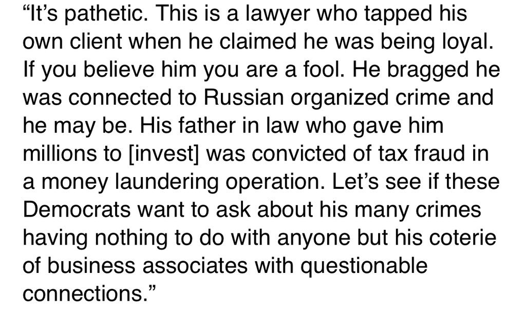 | Wat zo tragisch voor de Reps is, dat ze nu zouden kunnen inzien hoe slecht Trump is met het inschatten van juridische adviseurs. Ze maken hem af als zijnde Het Laagste Van Het Laagste, maar hun eigen heilige Donald vond hem een dikke 10 jaar een opperbeste fixer. Sad. |