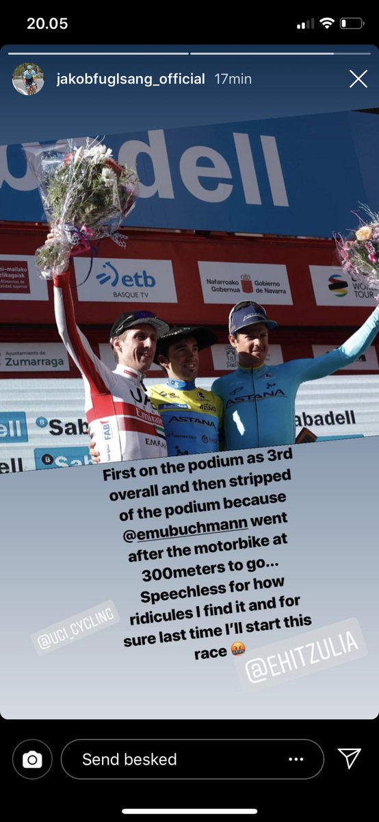 https://twitter.com/wcsbike/status/1117090079980367872 beelden laatste km. Buchmann werd eerst als 4e gerankt maar organisatie heeft hem toch op zelfde tijd als Mollema en Landa gezet waardoor hij 3e werd. | |