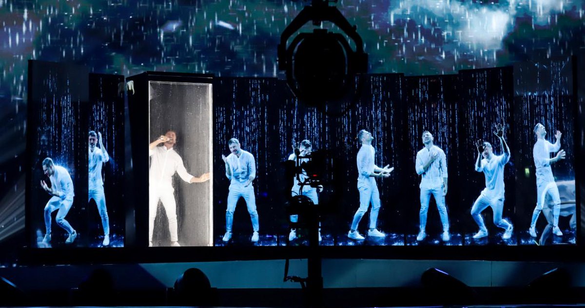 Duncan en zijn piano worden op het podium gebeamed door lasers ![]() | |
