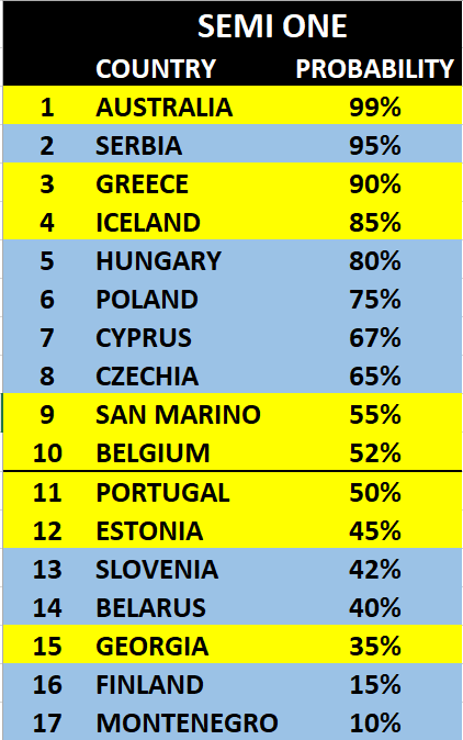 Uit deze helft? IJsland, Griekenland, Australie (vooral door de staging). Dat zijn wel echt de grote favorieten, naar mijn mening.