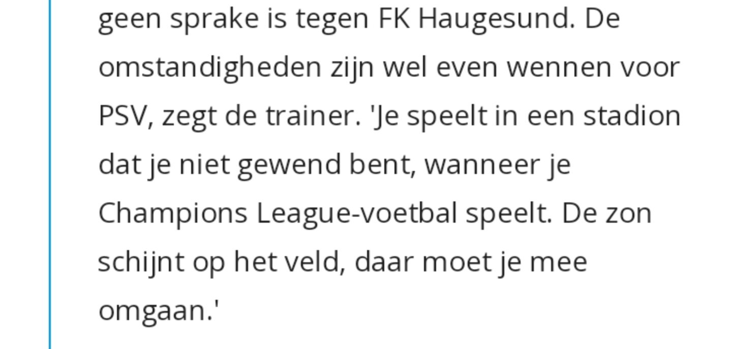 Het is een lichtelijke overdrijving. Het is wel een gestolen overwinning, een gelijkspel was meer op zijn plaats. Op 20 minuten na heeft PSV niet de overhand kunnen nemen. Haugesund had het betere van het spel alleen kwamen ze kwaliteit te kort om het af te maken. De volgende EL ronde gaat dit spel hard afgestraft worden als je tegen een ploeg moet die wel effectief de laatste pass en bal goed kan geven. | |