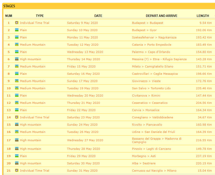 Beetje one-sided, weinig bergen in het begin, erg veel op het einde. Op CN waren ze eerst nog bezig met Fedaia en (weer) Finestre, maar die zie ik in dit lijstje niet voorbij komen?