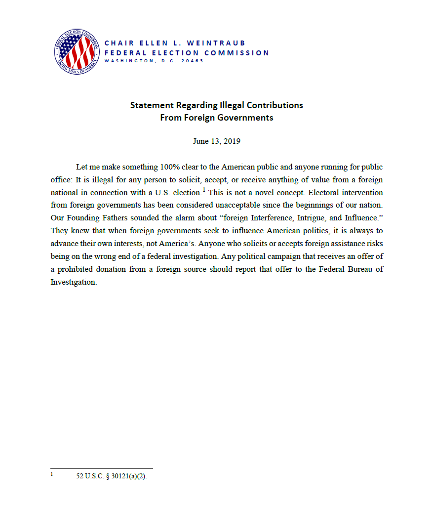 | 1 2 3 4 5 6 7 8 9 10 11 12 13 14 15 | (a) Prohibition It shall be unlawful for— (1) a foreign national, directly or indirectly, to make— (A) a contribution or donation of money or other thing of value, or to make an express or implied promise to make a contribution or donation, in connection with a Federal, State, or local election; (B) a contribution or donation to a committee of a political party; or (C) an expenditure, independent expenditure, or disbursement for an electioneering communication (within the meaning of section 30104(f)(3) of this title); or (2) a person to solicit, accept, or receive a contribution or donation described in subparagraph (A) or (B) of paragraph (1) from a foreign national. (b) “Foreign national” defined As used in this section, the term “foreign national” means— (1) a foreign principal, as such term is defined by section 611(b) of title 22, except that the term “foreign national” shall not include any individual who is a citizen of the United States; or (2) an individual who is not a citizen of the United States or a national of the United States (as defined in section 1101(a)(22) of title 8) and who is not lawfully admitted for permanent residence, as defined by section 1101(a)(20) of title 8. |