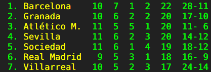 | Sociedad wint niet, Sevilla wint niet, Valencia wint niet, Atlético wint niet. Barça wel. Real Madrid, Villarreal en Granada moeten nog spelen.. | |