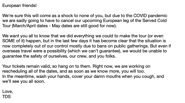 As you have probably figured out by now, several of our upcoming EU shows in April will be directly affected by the bans most European countries have imposed on larger events.