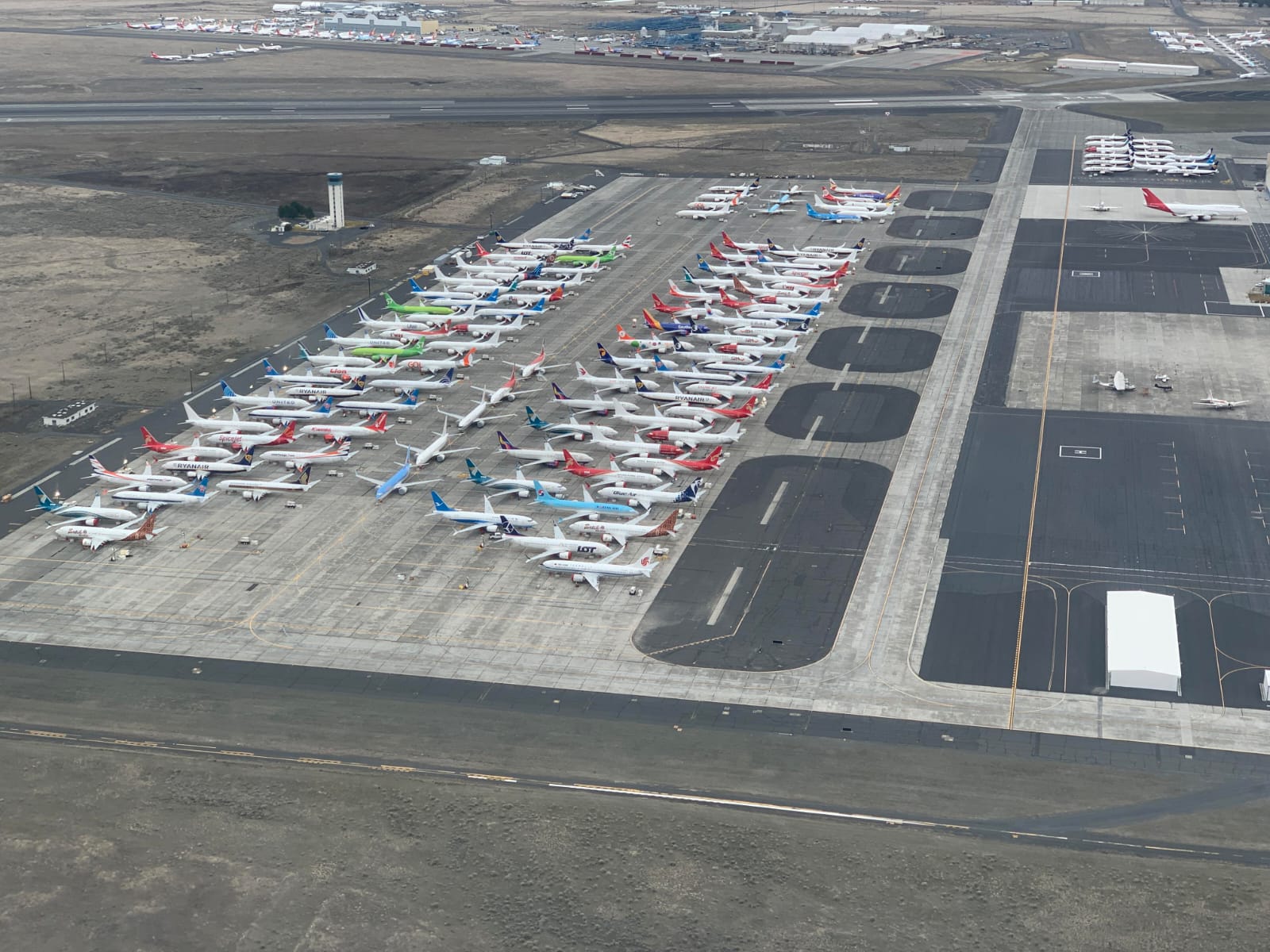 Ook in de achtergrond zie je overal 737 MAX-en staan. Ze hebben er nu meer dan 400 opgeslagen die niet mogen vliegen omdat er fouten in de software zaten.