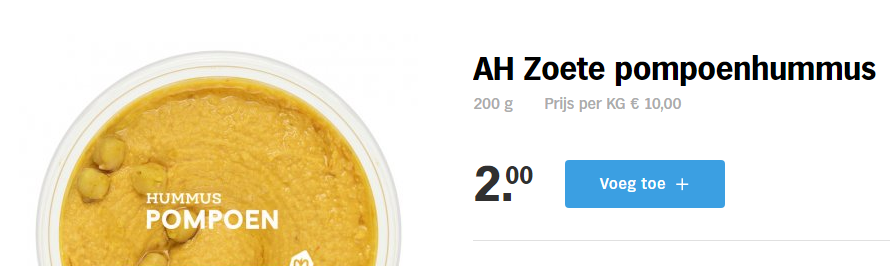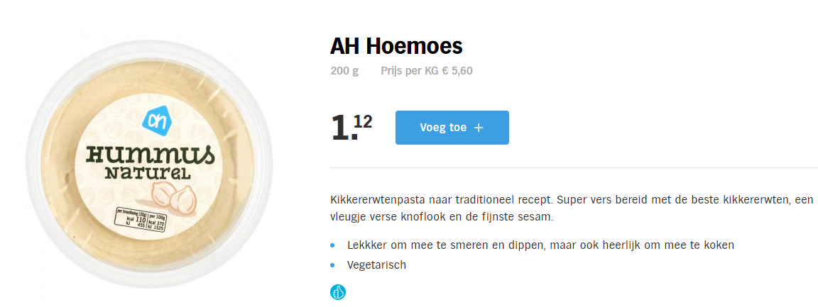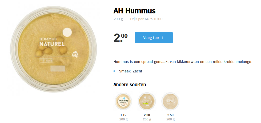 Echt grote verschillen in recept dus en toch allebei hummus naturel van de AH. Volgens mij is de duurdere bij de hapjes te vinden? | |