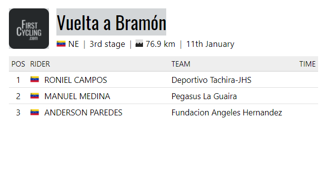 125%. Zijn grootste euvel is vandaag geweest en zijn behoorlijke tijdverlies was te verwachten, in de tijdrit van de Juventud (Vuelta a Colombia) U23 van vorige week werd hij ook weggereden. Brayan Obando is een andere leuke naam om te volgen, talentvolle Ecuadoraan bij UAE. Bij de junioren reed hij het Colombiaanse circuit op een hoop, maar vorig jaar als eerstejaars verdween hij van de aardbodem door Covid. Tot nu.quote: