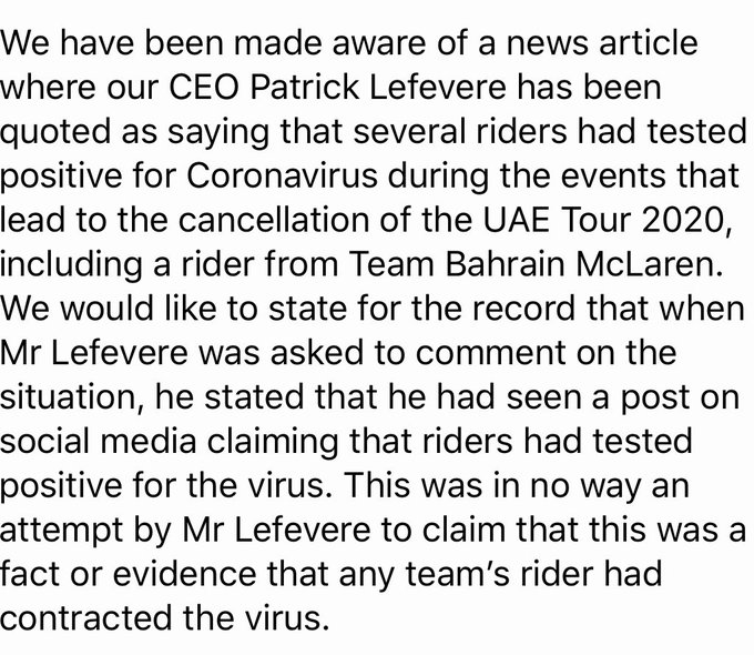 Al die paniek om iemand met een “normaal” griepje? ![]() Wel opvallend dat de organisatie van de koers zelf amper iets communiceert, nu krijg je allerlei verschillende verhalen | |