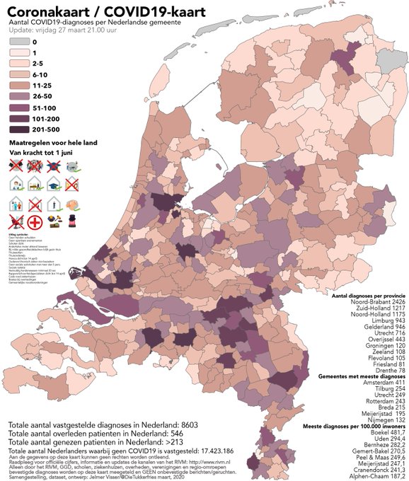 ![]() Houd minimaal 1.5 meter afstand met anderen buiten je huishouden in alle gevallen. Vragen over je eigen gezondheid: huisarts of GGD. Andere vragen: 0800-1351 (08:00-22:00) Helpen? https://www.extrahandenvoordezorg.nl/ https://www.rodekruis.nl/hulp-in-nederland/ready2help/ Informatie & achtergronden: • Wikipedia • Dagelijkse updates en analyse door Dr. John Campbell • Dit doet corona met je, als je pech hebt. • Artikel met simulaties over waarom social distancing werkt • Video over wat exponentiële groei is en hoe dat werkt bij uitbraken • Video over wat Corona is, wat het doet en de maatregelen • Alle artikelen over Covid zijn gratis te lezen op de financial times Nederland: • RIVM Rijksinstituut voor Volksgezondheid en Milieu - actuele informatie • Besmettingen per gemeente (RIVM-kaartje) • arcgis kaart van NL • Corona-patiënten op de Nederlanders IC's Internationale organisaties: • ECDC European Centre for Disease Prevention and Control • WHO World Health Organisation Aantallen & Trackers: • Overzicht JHU • Overzicht Worldometers • Overzicht thebaselab • Overzicht WHO • Overzicht BNO News • Alle gevallen, in een lijst • Spreadsheet met cijfers die user joyvke bijhoudt • Netherlands & Italy compare infected CORONAvirus (COVID-19) infected daily graph/chart Timelapse: • Flourish COVID-19 feiten • vooral hoest- en niesdruppeltjes zorgen voor overdracht • wie geen symptomen vertoont is onwaarschijnlijk het virus te verspreiden • de besmetting is meer dan bij seizoensgriep, maar gelukkig minder dan bij mazelen (2 < R0 < 3) • verreweg de meesten hebben lichte (griepachtige) klachten • bijna alle sterfgevallen betreffen ouderen of al zieke mensen Bron Gedragsregels in dit topic: • Probeer niet lollig te doen • Bij nieuws: graag een bron • Geen opruiende berichten • Volg de aanwijzingen van de moderatie op • Ga niet off-topic • Geen slowchat in dit topic. Hier is het slowchat-topic: COR / [En Don SC #1] HATSJOE • Let een beetje op elkaar ![]() | |