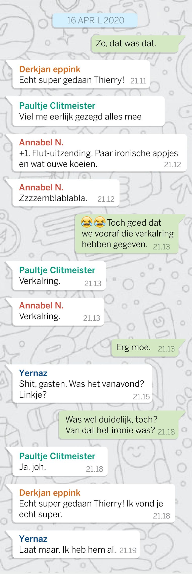 Geen idee, maar vooral het contextloos citeren uit de Whatsapp-conversatie vond ik erg laakbaar.quote:Op vrijdag 17 april 2020 12:46 schreef butz0rs het volgende: