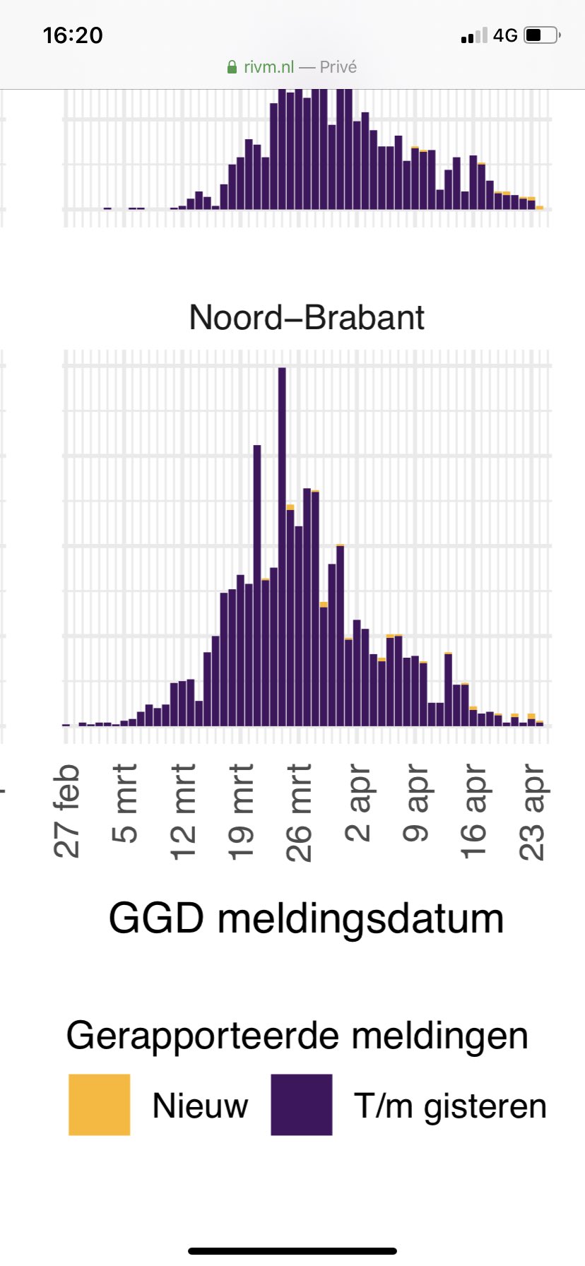 Ik lees ook verschillende berichten op regionale media. Amphia ziekenhuis zou dalend aantal patiënten hebben (Breda), maar het de TweeSteden ziekenhuis in Tilburg maakt zich zorgen omdat er nog steeds 70 a 80 patiënten per dag binnen komen. Dat is wel veel op een Nederlands totaal van zo'n 100/120. Dat zou betekenen dat Tilburg nog steeds wordt overlopen, maar in regio Breda niet meer.