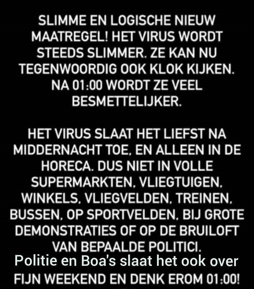 Blijkbaar geven de meeste mensen gevolg aan alles wat hen voorgeschoteld wordt. De angst wordt opgevoerd.quote:Op zaterdag 19 september 2020 22:51 schreef Orwell het volgende: