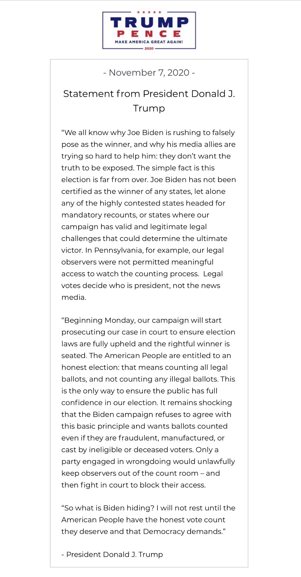 Is het niet andersom? Leuk voor trump maar op 1 januari verliest hij automatisch zijn status nu. Dus dan hoeven mensen ook wettelijk zijn bevel niet op te volgen.quote:Op zaterdag 7 november 2020 17:57 schreef Neef_Wuppie het volgende: