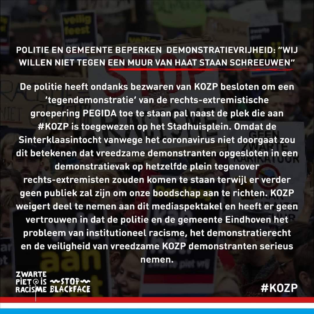 https://www.facebook.com/zwartepietisblackface/quote:Er waren al meer dan 500 aanmeldingen voor de demonstratie. Wij begrijpen het dat velen teleurgesteld zijn dat ze morgen niet van hun demonstratierecht gebruik kunnen maken. We roepen de politie en gemeente Eindhoven op om het demonstratierecht van KOZP-demonstranten een volgende keer beter te faciliteren en niet voor de dreiging van rechts-extremisten te buigen. Institutioneel racisme is een diep verankerd probleem in de Nederlandse samenleving. KOZP buigt niet voor geweld en intimidatie maar maakt deze keuze, omdat we weigeren in te stemmen met de repressieve maatregelen van de politie en de gemeente Eindhoven. Wij zullen in de nabije toekomst alsnog een statement maken.