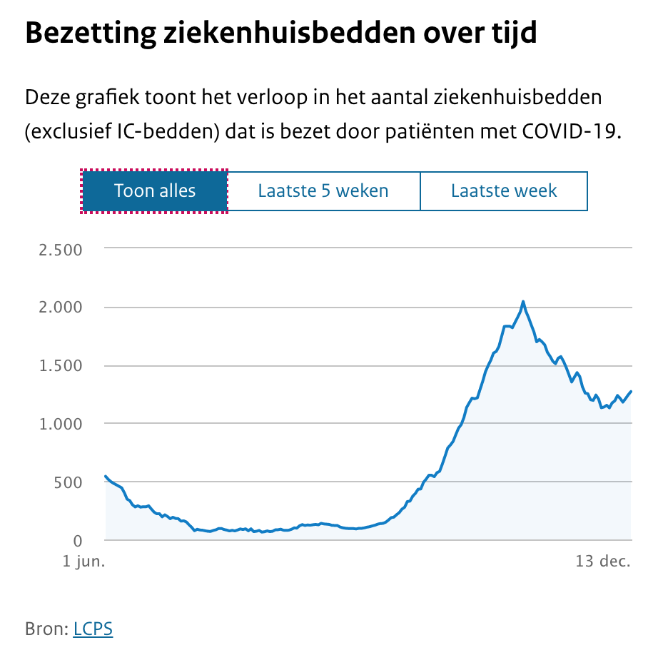 Laatst had ik die LCPS-grafieken gepost waaruit een stijging in het aantal bezette bedden niet zo goed te zien was, maar het viel me net op dat op het coronadashboard er wel vrij duidelijk een stijgende trend in beeld is: