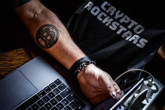 De getatoeëerde B met twee strepen siert nog altijd zijn onderarm. ,,De B van biljonair of van bankroet heb ik ooit gezegd. De kans dat het het eerste wordt is het grootst. Ik zie de koers volgend jaar wel stijgen naar 60.000 dollar of zelfs 100.000 dollar.’’