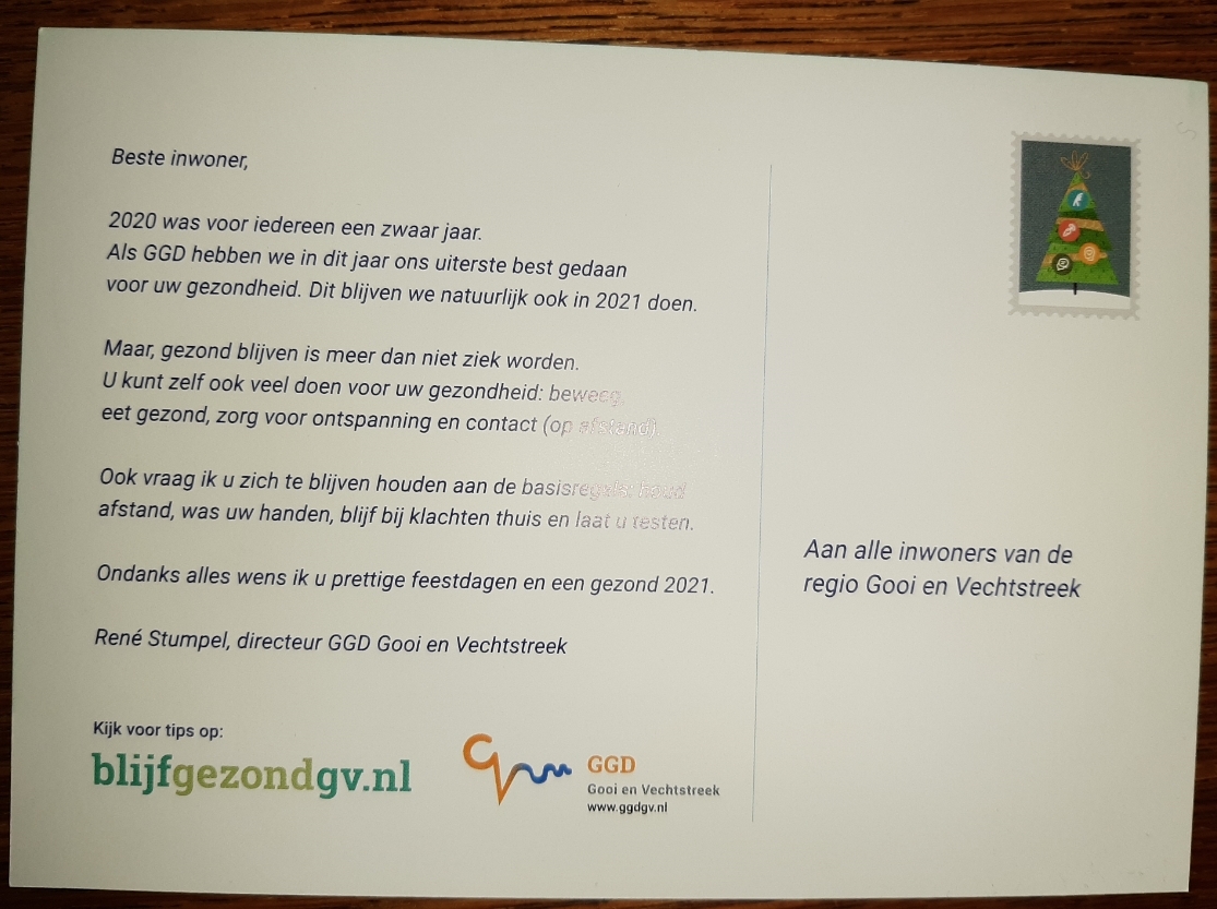 Kaartje in de bus van de GGD. Toch wel een aardig gebaar.
