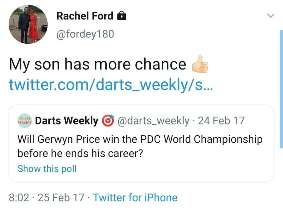 Precies mooi dat uitgerekend Price Van Gerwen van de nummer 1 stoot. Karma van de bovenste plank natuurlijk na dit arrogante interview. Typisch Van Gerwen. Hoogmoed komt ten val.