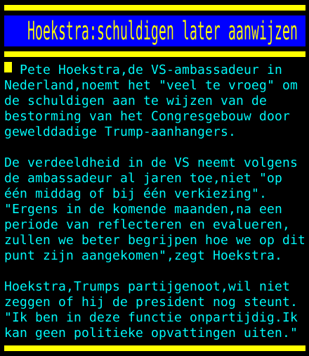 Vooral die laaste zin. Onpartijdig, en dan Baudet(van een 2 zetel non-issuepartij) uitnodigen voor een fundraise op de amerikaanse ambasadequote:Op donderdag 7 januari 2021 17:25 schreef Perrin het volgende: