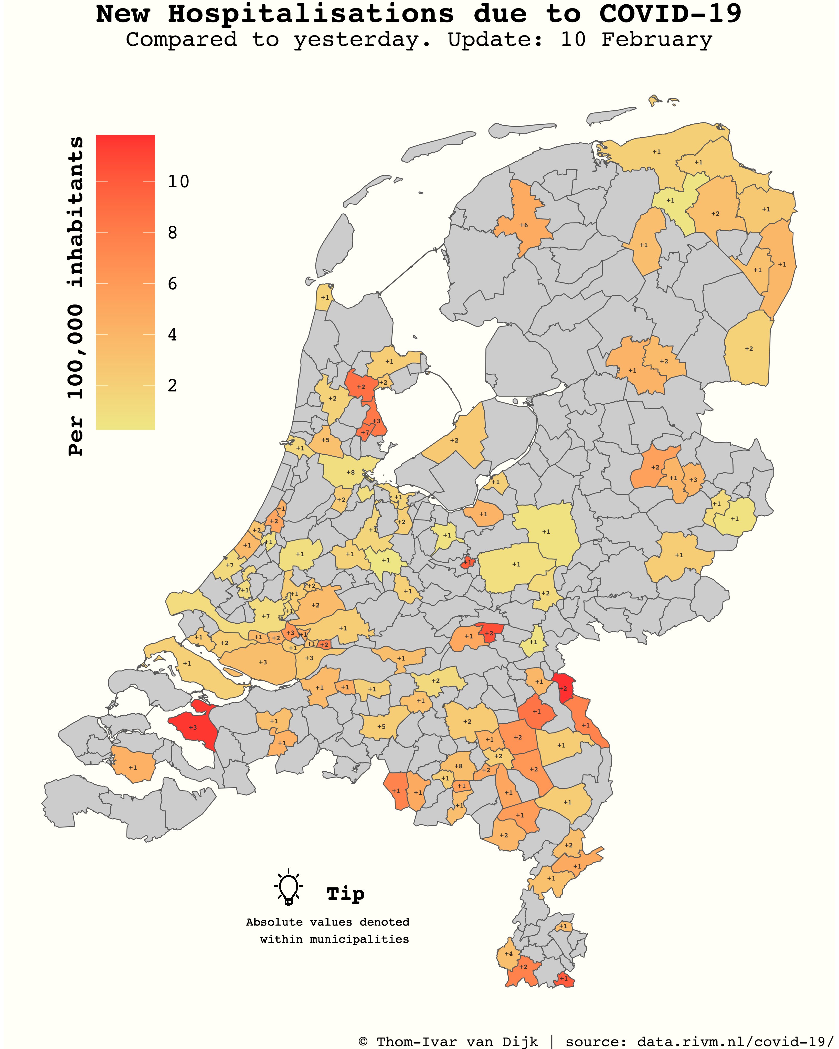 Totaal aantal besmettingen: 3226 Gemeentes met +10 besmettingen: 128 Amsterdam 77 's-Gravenhage 71 Rotterdam 70 Eindhoven 52 Utrecht 47 Amersfoort 37 's-Hertogenbosch 36 Almelo 35 Hoorn 32 Purmerend 32 Dordrecht 32 Tilburg 30 Groningen 29 Leeuwarden 29 Enschede 27 Hilversum 27 Alkmaar 26 Venlo 26 Zwolle 25 Haarlemmermeer 25 Katwijk 24 Helmond 24 Roosendaal 24 Rijssen-Holten 23 Heerlen Daarnaast zijn er: 17 gemeentes met 0 besmettingen 23 gemeentes met 1 besmettingen 95 gemeentes met 2-4 besmettingen 108 gemeentes met 5-9 besmettingen Deze update is ook dagelijks om 15:16 te vinden op https://rivm.useless.nl of voor een volledig gemeenteoverzicht op https://rivm.useless.nl/total.php | |