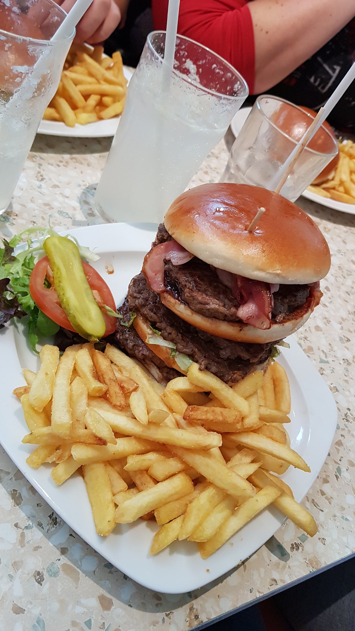 Eigenlijk maar met een heel paar ingredinten. Gewoon een hamburgerbroodje, ijsbergsla, 100% rundvleesburger en... hun huisgemaakte warme shaslicksaus erover (zat paprika, ui, champignons e.d. in). En die saus maakte dat echt een superlekkere burger![]()
