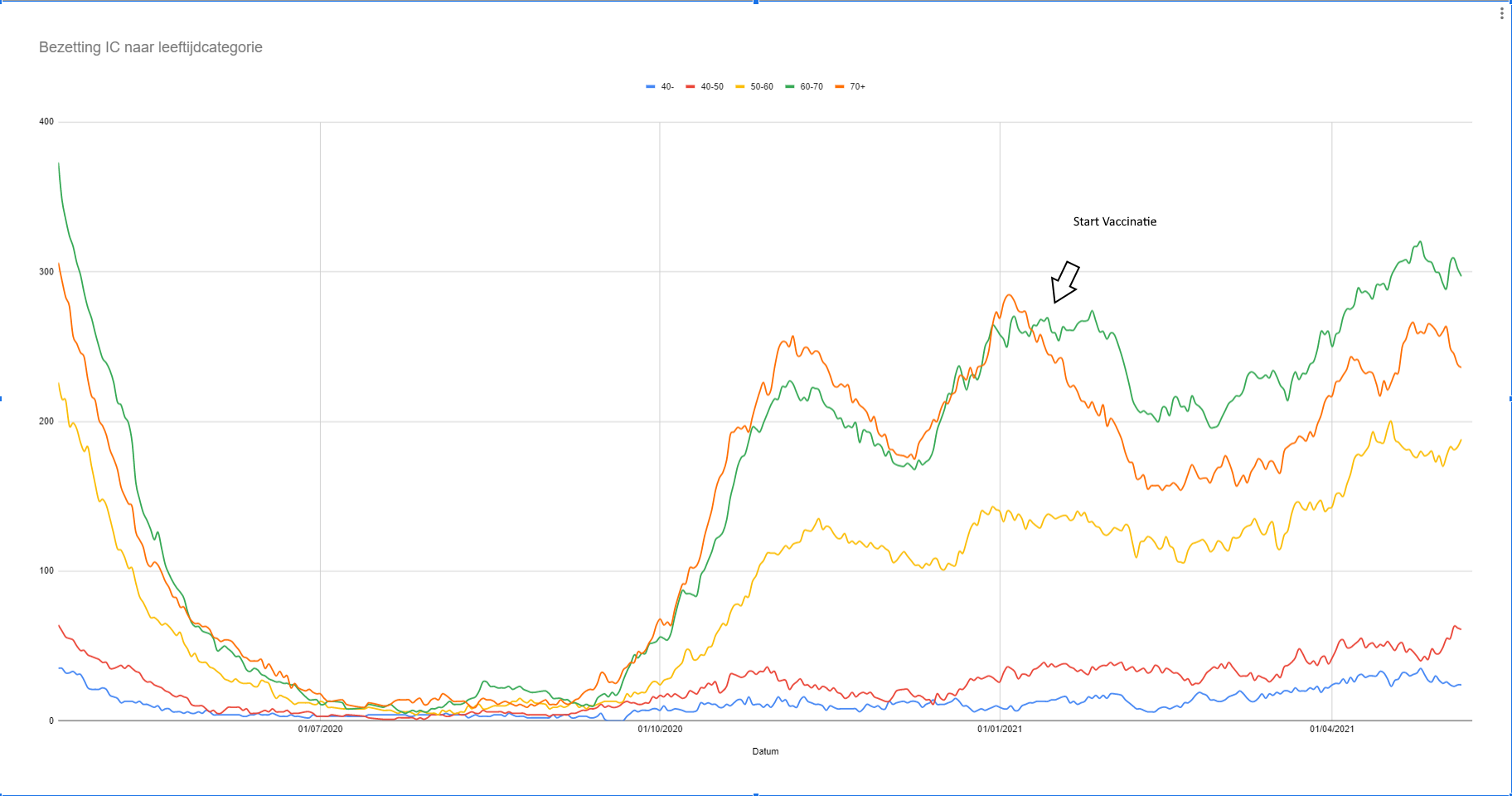 Feitelijk hebben we natuurlijk mooie data van voordat we met vaccineren begonnen, daarin zien we dat de groep 70+ heel strikt de lijn van de groep 60-70 volgt, let nu op wat er gebeurt vanaf het start van het vaccineren, je ziet al vrij snel dat de groep 70+ niet langer meer de grootste is, en dat 60-70 de nummer 1 word, dat is natuurlijk ook logisch omdat we voornamelijk van oud naar jong vaccineren. Echter nu komt de crux, ook de groep 70+ stijgt nog! Waarom zijn deze 2 weken cruciaal? Het is een beetje een inschatting, maar nu zou ongeveer de periode moeten zijn dat we ook het vaccinatie effect gaan zien bij de boomers, echter als het in dit tempo blijft door stijgen en we krijgen nog een tegenvaller op de 70+ groep, dan voorzie ik dat we weer ruim de 800 in gaan.