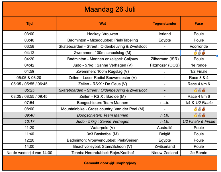 Badminton, Beachvolleybal en 3x3 basketbal. Puur over de Nederlanders gesproken dan. Enige verschil met gister en vandaag is dat er geen hockey en/of voetbal is.