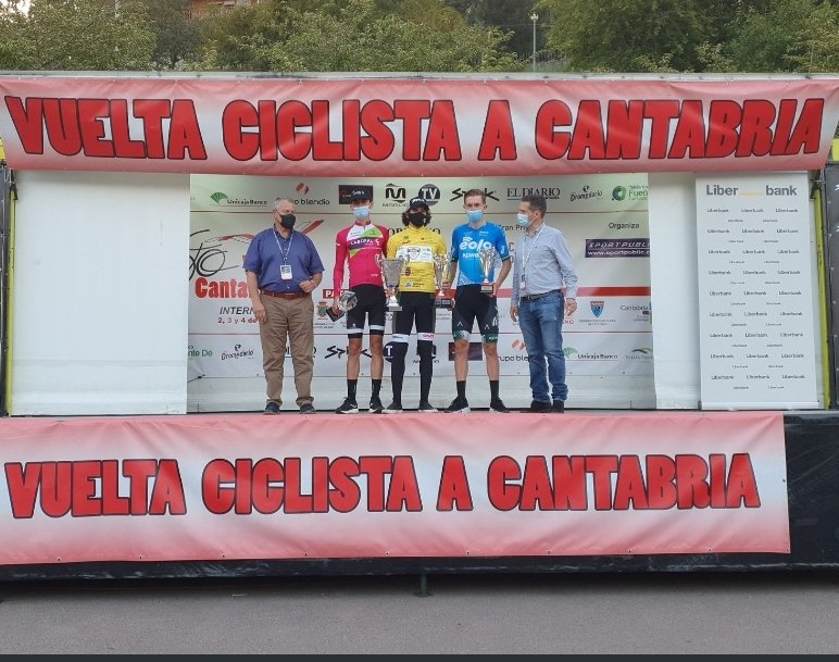 Hier, schitterend in het geel, staat Vinicius Rangel, die zojuist de Ronde van Cantabrië heeft gewonnen. Hij klopt hier Unai Iribar, niet de minste. Na twee prachtige jaren bij de junioren in de ploeg van Valverde rijdt hij dit jaar bij Telcom. Eus, you know what to do.