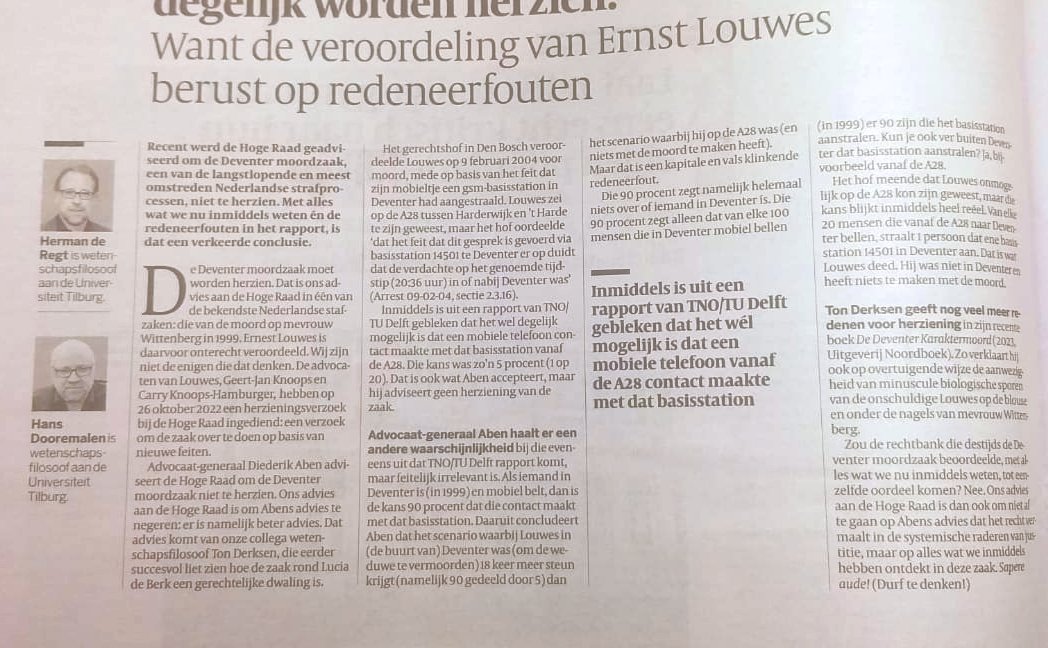 Derksenquote:Advocaat-generaal Aben haalt er een andere waarschijnlijkheid bij die eveneens uit dat TNO/TU Delft rapport komt, maar feitelijk irrelevant is. Als iemand in Deventer is (in 1999) en mobiel belt, dan is de kans 90 procent dat die contact maakt met dat basisstation. Daaruit concludeert Aben dat het scenario waarbij Louwes in (de buurt van) Deventer was (om de weduwe te vermoorden) 18 keer meer steun krijgt (namelijk 90 gedeeld door 5) dan het scenario waarbij hij op de A28 was (en niets met de moord te maken heeft). Maar dat is een kapitale en vals klinkende redeneerfout.