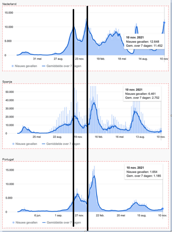Ik bedoel dat de piek van Nederland vergelijkbaar is met die van Spanje en Portugal. Ik zie niet zozeer een duidelijke vertraging. Misschien van een week.quote:Op donderdag 11 november 2021 10:14 schreef Benny het volgende: