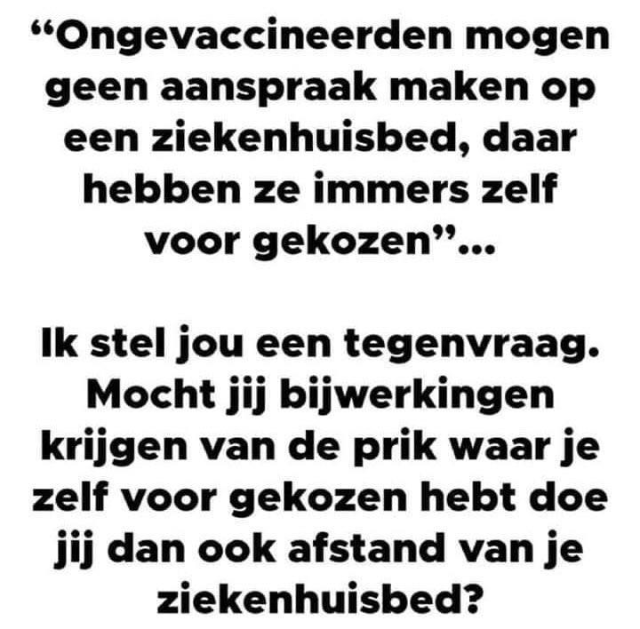 Door je niet te laten vaccineren sluit je juist ook risico’s uit Toen de eerste vaccinatieronde startte, besloot ik de kat nog even uit de boom te kijken. Ondertussen wordt de druk op ongevaccineerden steeds meer opgevoerd. Omdat ik dit jaar zestig ben geworden, ontving ik onlangs van de huisarts een officile uitnodiging voor een gratis griepprik. Hoewel het bijgevoegde schrijven repte van „een grote kans om ernstig ziek te worden”, meende ik dat n kalenderjaar heus niet zoveel verschil zou maken en dus liet ik op de vastgestelde datum verstek gaan. Wat meespeelde is dat ik slechts twee keer in mijn leven flink de griep heb gehad, beide keren tijdens een bijzonder stressvolle periode op mijn werk. Nu ik niet langer in loondienst ben, stress zoveel mogelijk vermijd en zo gezond mogelijk probeer te leven, leek de kans om heel ziek te worden van influenza me tamelijk klein. Niemand die er verder naar vroeg en niemand die op het idee kwam me een antivaxxer te noemen. Opmerkelijk genoeg gelden voor het coronavaccin heel andere regels en heel andere maatstaven. Hoewel vrijwilligheid voorop stond en nog altijd met de mond wordt beleden, wordt de druk op ongevaccineerden opgevoerd. In familiekring leidt het tot morele druk, terwijl de overheid de duimschroeven langzaam maar zeker steeds verder aandraait en maatschappelijke uitsluiting gebruikt als pressiemiddel. Zelf aarzelde ik omdat ik het vaccin niet helemaal vertrouw en de farmaceutische industrie al helemaal niet. In december 2020 noteerde ik in mijn aantekeningen, toen nog met een vraagteken, de mogelijkheid dat het vaccin pas werkzaam zou zijn bij een jaarlijkse herhaalprik. Dat bleek nog optimistisch ingeschat, want het Janssen-vaccin heeft na amper zes maanden al sterk aan kracht ingeboet. Niemand weet ook of de aangekondigde boosterprik meteen ook echt de laatste is. Ondertussen wordt steeds waarschuwend gesproken over een „pandemie van ongevaccineerden”, terwijl het gevaar vooral schuilt in gevaccineerden die met hun QR-code overal toegang hebben terwijl ze ongemerkt besmet kunnen zijn. Daar komen nog de gevaccineerden bij die zich onterecht volledig beschermd voelen en mensen die zich veilig wanen in het gezelschap van gevaccineerden en daarom losser met de regels omgaan. Hoewel ik nog steeds niet gevaccineerd ben, ben ik tot op heden niet besmet geraakt en heb ik ook niemand besmet. In die zin zou je kunnen zeggen dat ik vooralsnog part noch deel heb aan de pandemie. Op kritische vragen antwoord ik steevast dat ik statistisch gezien waarschijnlijk meer kans heb in het ziekenhuis te belanden door een appende automobilist die mij in het halfdonker van mijn fiets rijdt, dan vanwege het coronavirus. De bottomline is dat iedere ongevaccineerde elk moment van gedachten kan veranderen en kan besluiten zich alsnog te laten inenten, terwijl andersom onmogelijk is. Je kunt ook zeggen dat je door jezelf niet te laten vaccineren wellicht iets meer risico loopt om ernstig ziek te worden, maar tegelijk honderd procent zeker weet dat je niet getroffen zult worden door eventuele schadelijke bijwerkingen. https://www.rd.nl/artikel(...)uist-ook-risicos-uit | |
