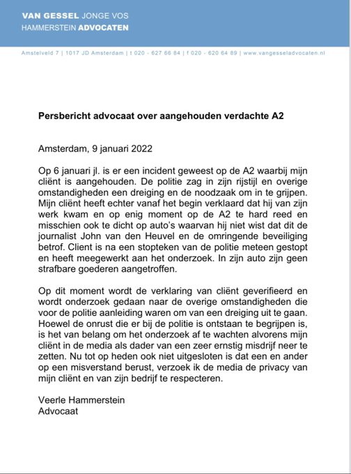 Lijkt me niet dat je met zoveel bombarie wordt aangehouden op de A2 met tientallen agenten en drie heli's als je alleen maar een beetje te hard reed naast een auto met toevallig een misdaadverslaggever erin. Er zal heus meer bewijslast zijn.