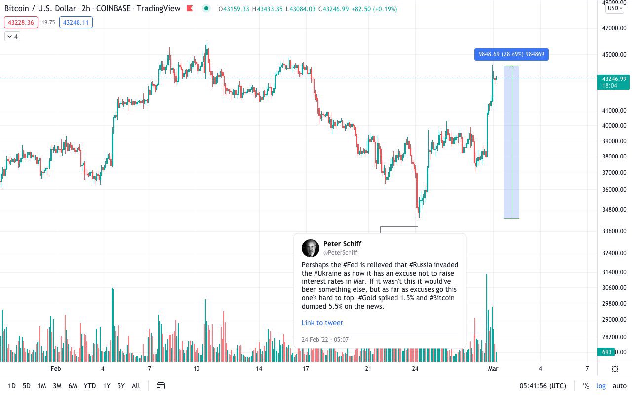 Toen duidelijk werd dat Rusland van Swift gebruik kon blijven maken schoot Bitcoin omhoog.quote:Op donderdag 24 februari 2022 23:45 schreef Mortaxx het volgende: