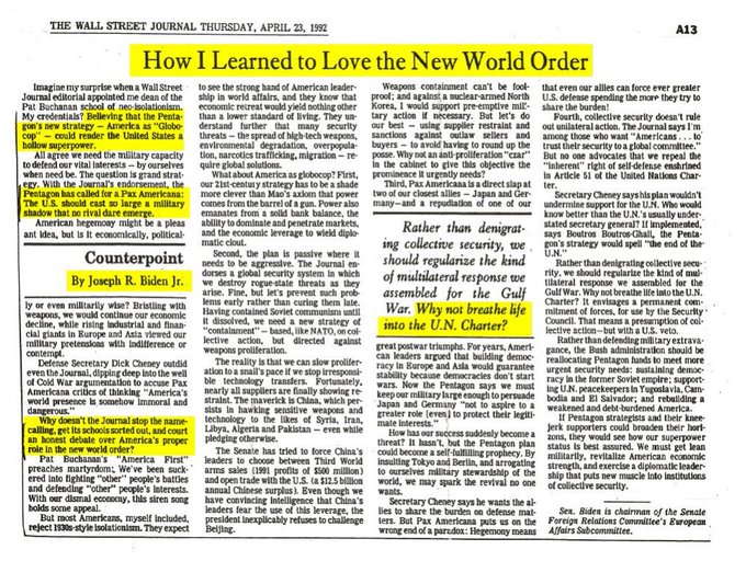 Verder is Biden een grote liefhebber van de nieuwe wereld orde, zie hier een artikel uit 1992